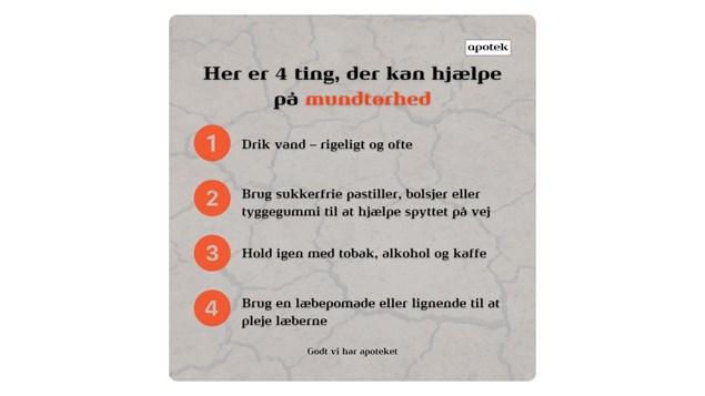 Du kan også altid spørge apoteket til råds om hvordan du kommer den tørre mund til livs, og hvad du selv kan gøre, for at mundtørheden ikke ender med alvorlige mund- og tandproblemer