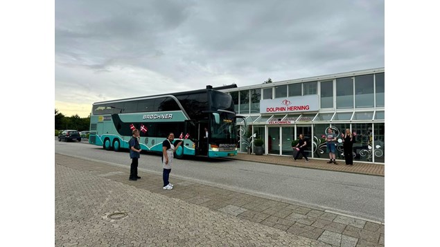 Julie og dobbeltdækkeren på vej til Venø med gæster, meldt af Ans Rejser A/S