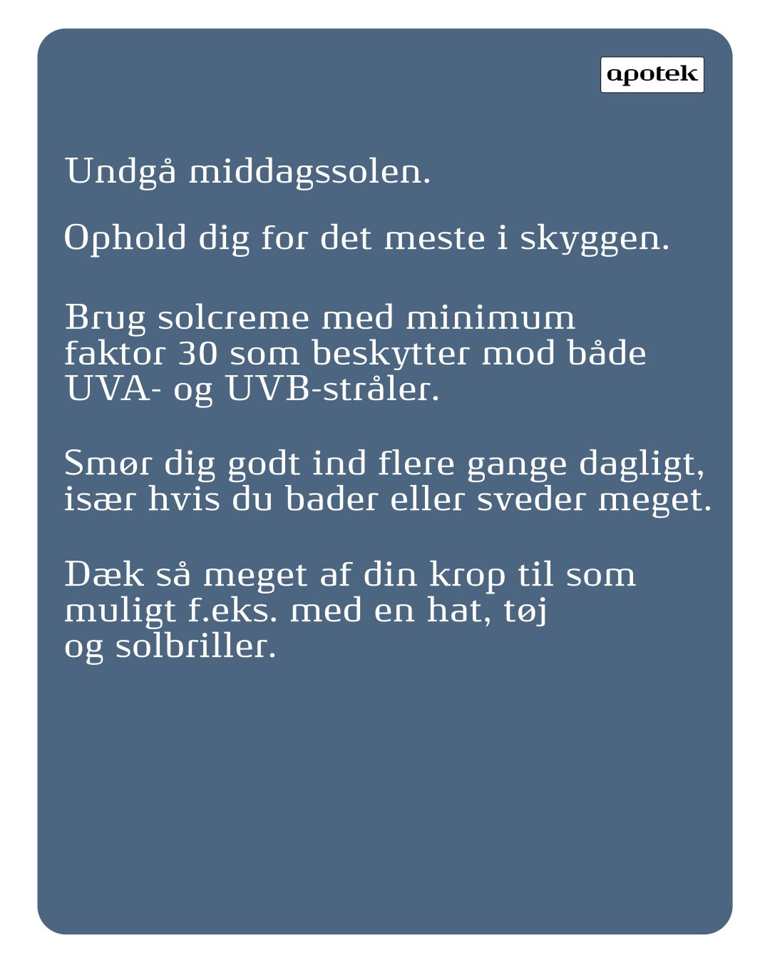 Tjek indlægssedlen, der følger med din medicin, for at se om din medicin kan gøre din hud ekstra lysfølsom. Læs afsnittet om ‘Bivirkninger’. Du kan også altid spørge os på apoteket og få mere viden på apoteket.dk/fotosensitivitet